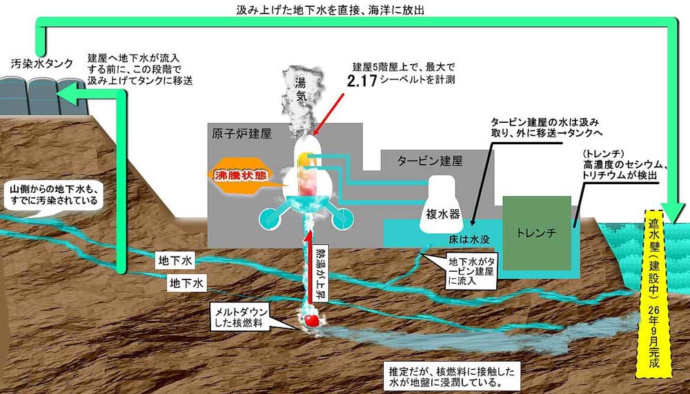 However at Fukushima we have THREE full meltdowns  and they are sitting on fractures bedrock right on the ocean so despite what TEPCO is saying, the radiation has been leaking directly in to the ocean via ground water beneath the plants since the beginning  We showed that back at ATS when this started