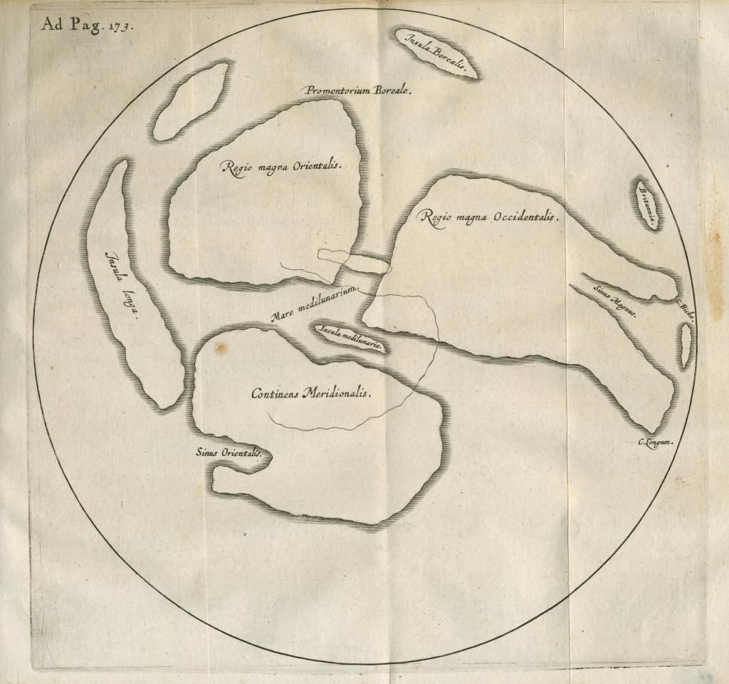 The oldest known moon map with the naked eye, drawn around 1600 by Gilbert, but first published in his book from 1651.