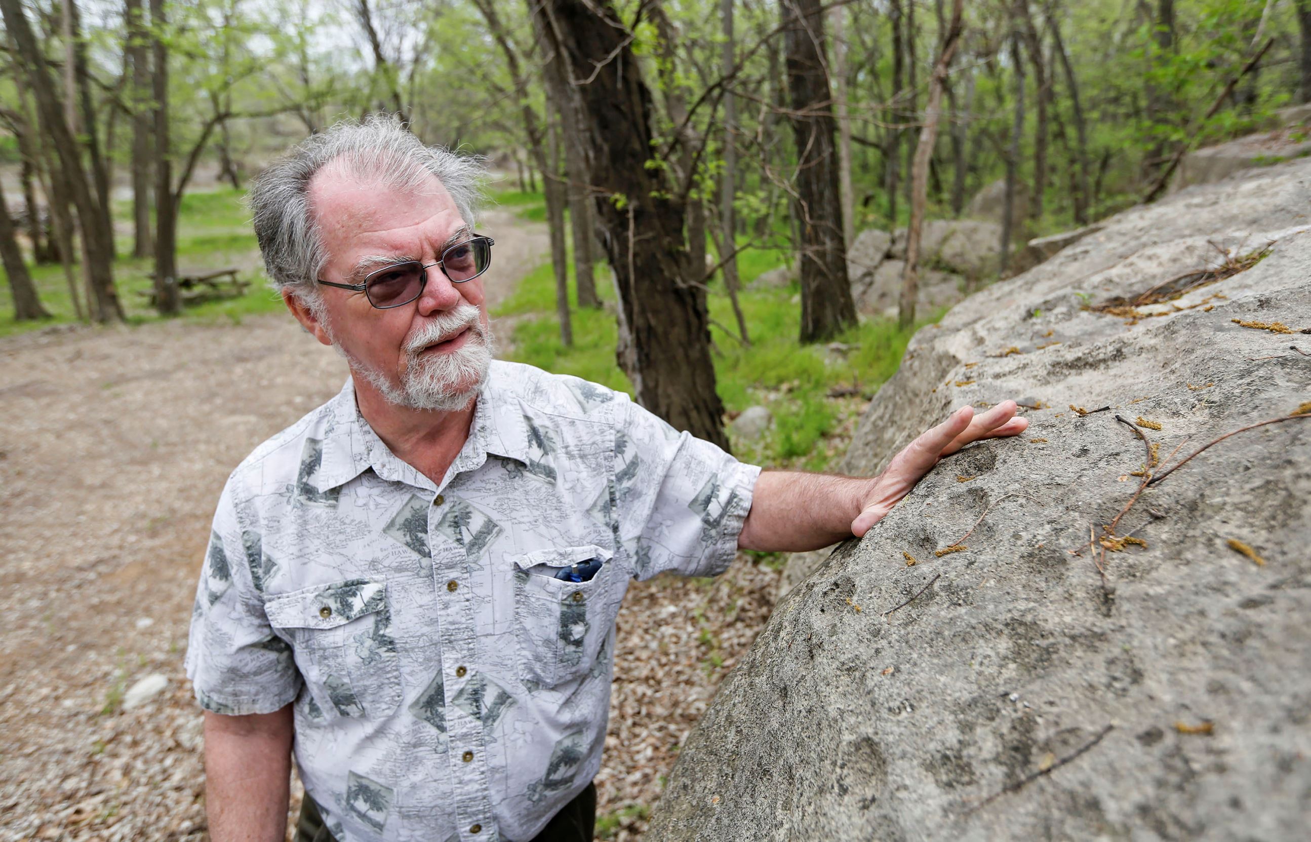 © Travis Heying/Wichita Eagle/TNS Wichita State archaeologist and anthropologist Donald Blakeslee points out man-made depressions on a boulder in what would have been the lost city of Etzanoa, a home...