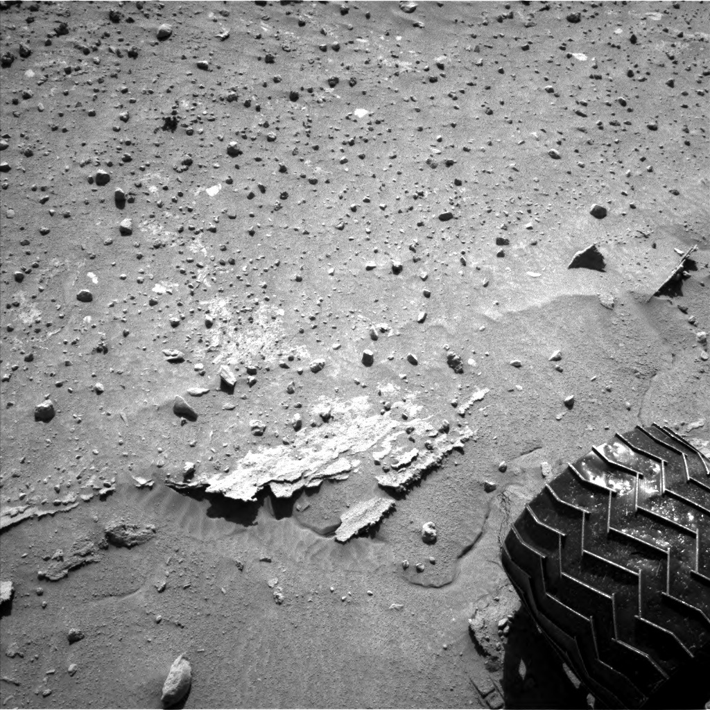 Sol 603 Salt crusts Tire for scale This image was taken by Navcam: Left B (NAV_LEFT_B) onboard NASA's Mars rover Curiosity on Sol 603 (2014-04-17 17:28:39 UTC).