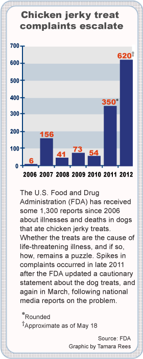 Meanwhile, the number of complaints is skyrocketing, surpassing 600 in the first 5-1/2 months of this year alone. The FDA has received about 1,300 complaints total since 2006, according to Laura Alvey, a spokeswoman for the FDA Center for Veterinary Medicine.