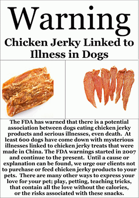 Dr. Tony Buffington, the Ohio State University Veterinary Medical Center's veterinary nutritionist, created a poster to display in the hospital for companion animals to warn clients of the potential risk of feeding their pets' chicken jerky (see below).