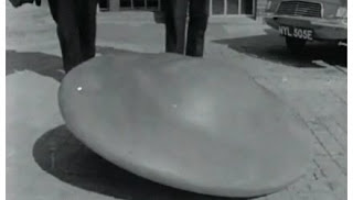 In 1967, a bunch of engineering apprentices created six fake UFOs, then placed them in a line, an equal distance apart, miles across Britain. The UFOs, which looked like sleek sunny-side up eggs, were programmed to make a strange wailing noise, and secreted inside was a strange foul-smelling goo (a boiled bread concoction made by the pranksters.) From a recent Daily Mail article: