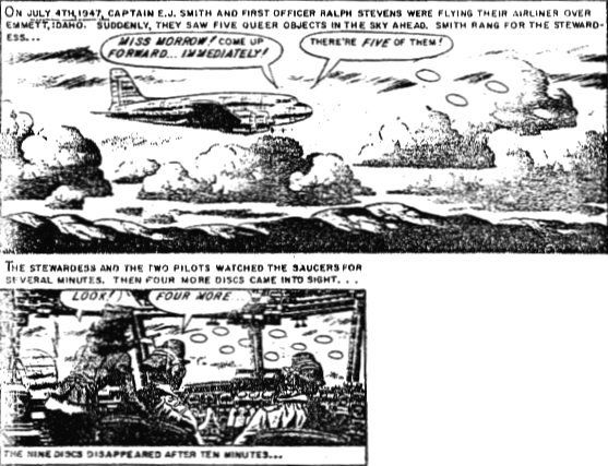 "At first I thought it was a group of light planes returning from some Fourth of July celebration," said Smith, "but then I realized the things were not aircraft, but were flat and circular." Not believing their eyes, they called the stewardess, Miss Marty Morrow, forward. Without telling her what to look for, they directed her attention to the sky ahead of them. Looking out the cockpit window, Miss Morrow exclaimed, "why, there's a formation of those flying discs!"