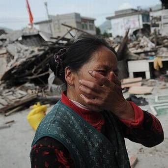 A village woman reacts after her house was damaged by an earthquake in Lushan county, Ya'an, southwest China (AP)