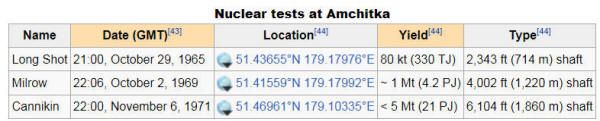 Quote"The largest underground nuclear test conducted by the United States, Project Cannikin was one of three underground nuclear tests performed at different places on this 43-mile long island in the Aleutian Chain.