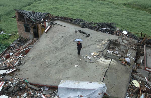 A woman stands on a collapsed house in Longmen township, one of the seriously-damaged towns in disaster-hit Yaan, southwest China's Sichuan province, on April 23. (AFP/Getty Images)