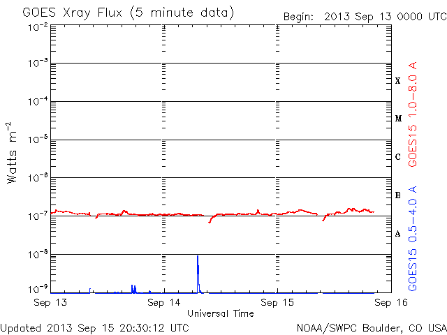 QuoteALL QUIET ALERT: With the Sun's disk almost completely devoid of sunspots, solar flare activity has come to a halt. Measurements by NOAA's GOES 15 satellite show that the sun's global x-ray emission, a key metric of solar activity, has flatlined:
