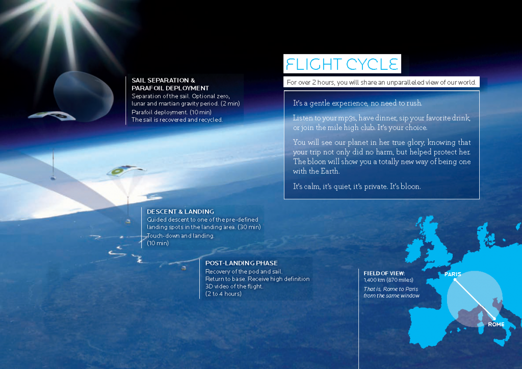 bloon is a pod designed by zero2infinity that will take passengers up to Near-Space to admire the view of the Earth thanks to high-altitude balloons. The flight will take off from Spain and offer a leisurely 2 hours at maximum altitude to take in the experience and change your perspective on Earth forever. "We believe high-altitude balloons provide an amazing opportunity to see the Earth from Space in a safe and comfortable manner. The view at 36km is not so different than the view at 100km, the sky is black, the atmosphere is below, the curvature of the Earth is clearly visible" explains Mr. López Urdiales.