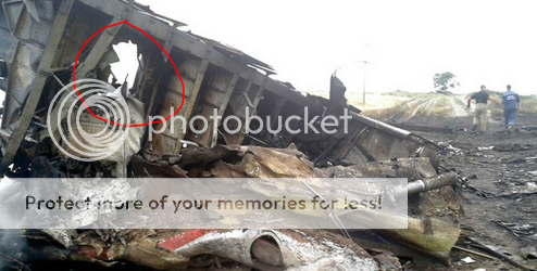 here is the suspect hole with metal bent inward.possible missile hole on downed plane in ukraine.