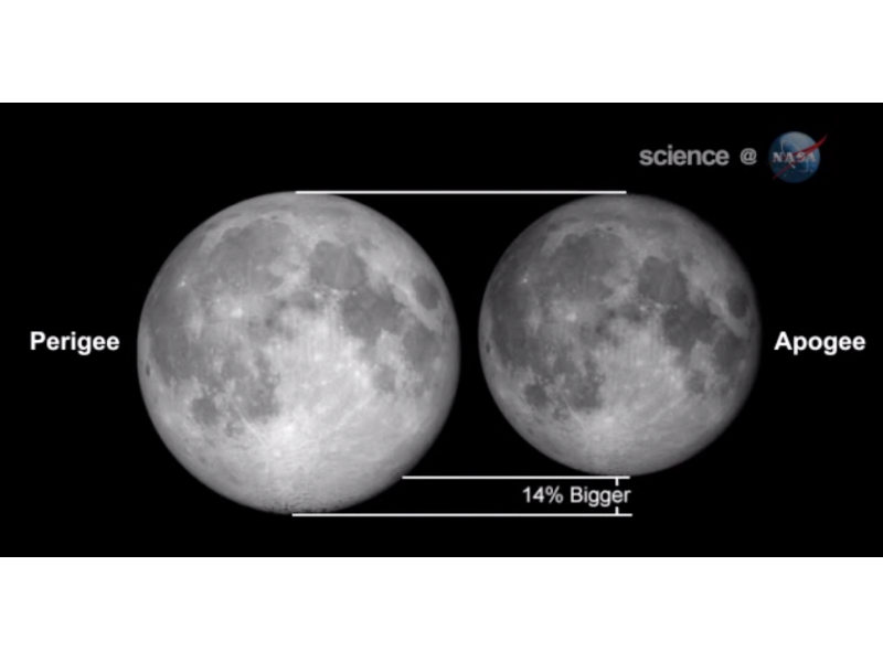While the physical moon will not actually grow in size, it will appear bigger in the night sky because it is slightly closer to Earth than normal. Below is a photo that shows a supermoon on the right compared to an average full moon on the left: