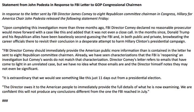 "The Director owes it to the American people to immediately provide the full details of what he is now examining. We are confident this will not produce any conclusions different from the one the FBI reached in July," Podesta said in a statement.