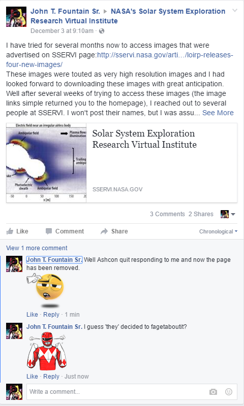 These images were touted as very high resolution images and I had looked forward to downloading these images with great anticipation. Well after several weeks of trying to access these images (the image links simple returned you to the homepage), I reached out to several people at SSERVI. I won't post their names, but I was assured in several emails that it was a reorganization of server files problem and that it would be fixed forthwith. I have continued to reach out to the SSERVI team and was told it would take a little longer. The holidays being what they are, I waited and waited and then my emails were not answered as to when these images would be made available as ADVERTISTED!.......Nothing....Now the original page with these images listed is no longer available!....So I'm reaching out once again, this time on your Facebook page, to please make these images available to the public. Thank you for all your efforts.